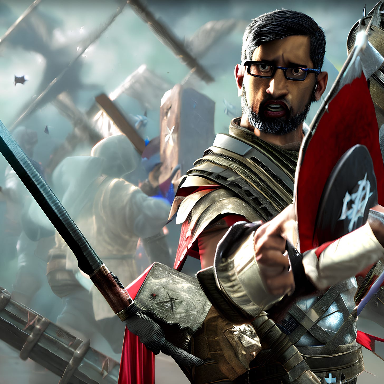 (Image Prompt: tech executive Sundar Pichai doing a nerdy LARP involving hand to hand battle with battle axe and spear 3D HD photorealistic with a grenade in the air about to hit the combatants)